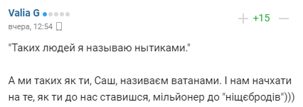 "А мы таких как ты, Саша, называем ватниками. И нам плевать на то, как ты к нам относишься, миллионер к "нищебродам")))".