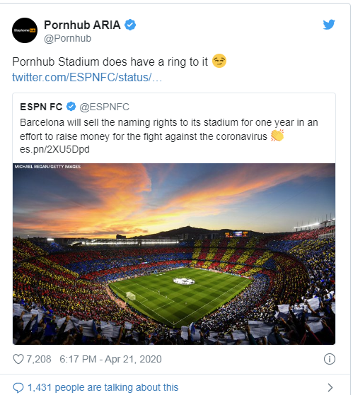 Известный порносайт PornHub прокомментировал заявление "Барселоны", которая намерена продать название клубного стадиона, чтобы направить полученные средства на борьбу с пандемией китайского коронавируса.