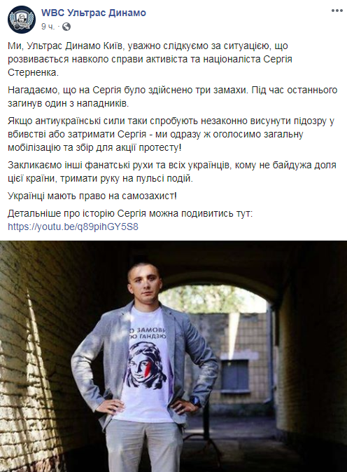 "Мы, ультрас "Динамо" Киев, внимательно следим за ситуацией, развивающейся вокруг дела активиста и националиста Сергея Стерненко. Напомним, что на Сергея было осуществлено три покушения. Во время последнего погиб один из нападавших. Если антиукраинские силы таки попытаются незаконно выдвинуть подозрение в убийстве или задержать Сергея - мы сразу же объявим всеобщую мобилизацию и сбор для акции протеста! Призываем другие фанатские движения и всех украинском, кому не безразлична судьба этой страны, держать руку на пульсе событий. Украинцы имеют право на самозащиту!" - говорится в заявлении фанатов.