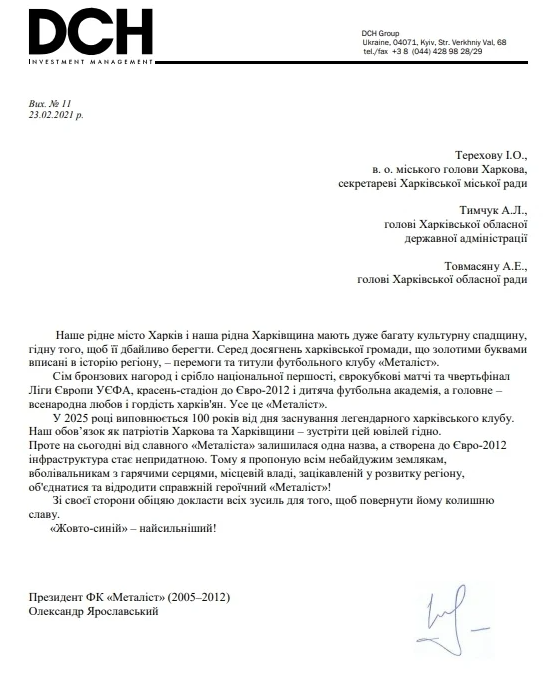 "В 2025 году исполняется 100 лет со дня основания легендарного харьковского клуба. Наша обязанность как патриотов Харькова и Харьковщины - встретить этот юбилей достойно. Однако на сегодняшний день от славного "Металлиста" осталось одно название, а созданная к Евро-2012 инфраструктура становится непригодной. Поэтому я предлагаю всем неравнодушным землякам, болельщикам с горячими сердцами, местной власти, заинтересованной в развитии региона, объединиться и возродить настоящий героический "Металлист"! Со своей стороны обещаю приложить все усилия для того, чтобы вернуть ему былую славу", - говорится в обращении.