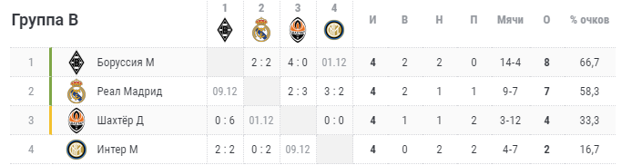 Менхенгладбахская "Боруссия" благодаря двум победам над "Шахтером" воцарилась на первом месте. Немецкому клубу для выхода в плей-офф достаточно набрать два очка в двух оставшихся матчах с "Интером" и "Реалом". "Шахтер" также еще может выйти из группы. Для гарантированного выхода в 1/8 финала "горнякам" нужно обыгрывать "Реал" и "Интер". Что касается итальянского клуба, то ему нужно выигрывать в обоих оставшихся матчах у "Боруссии" и "Реала", а также надеяться на осечки конкурентов.