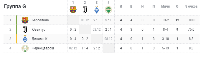 "Барселона" и "Ювентус" уверенно вышли в плей-офф, не потеряв ни одного очках в матчах с "Динамо" и "Ференцварошем". Впрочем, борьба за первое место и место в Лиге Европы будет идти до последнего тура. В следующем туре "Барселона" сыграет с "Ференцварошем", а "Динамо" встретится с "Ювентусом".