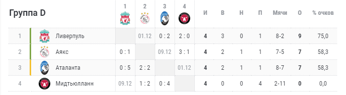 "Ливерпуль" мог обеспечить себе выход в плей-офф, но проиграл дома "Аталанте", после чего ситуация в группе обострилась. Более того, англичане могут опуститься даже на третье место, если в следующем туре проиграют "Аяксу". Впрочем, в последнем туре "Ливерпуль" сыграет с аутсайдером группы "Мидтъюлландом", поэтому вариант с невыходом мерсисайдцев в плей-офф практически исключен. За вторую путевку поборются "Аякс" и "Аталанта", которые в последнем туре сыграют между собой.