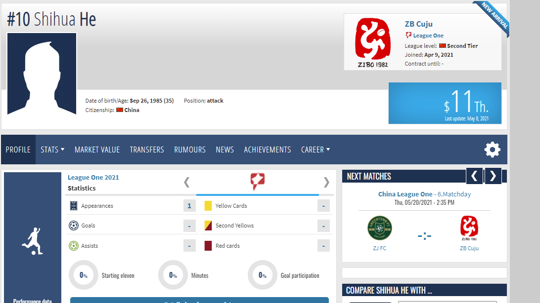 Хэ Шихуа также один раз вышел на поле и его профиль даже появился на портале Transfermarkt.