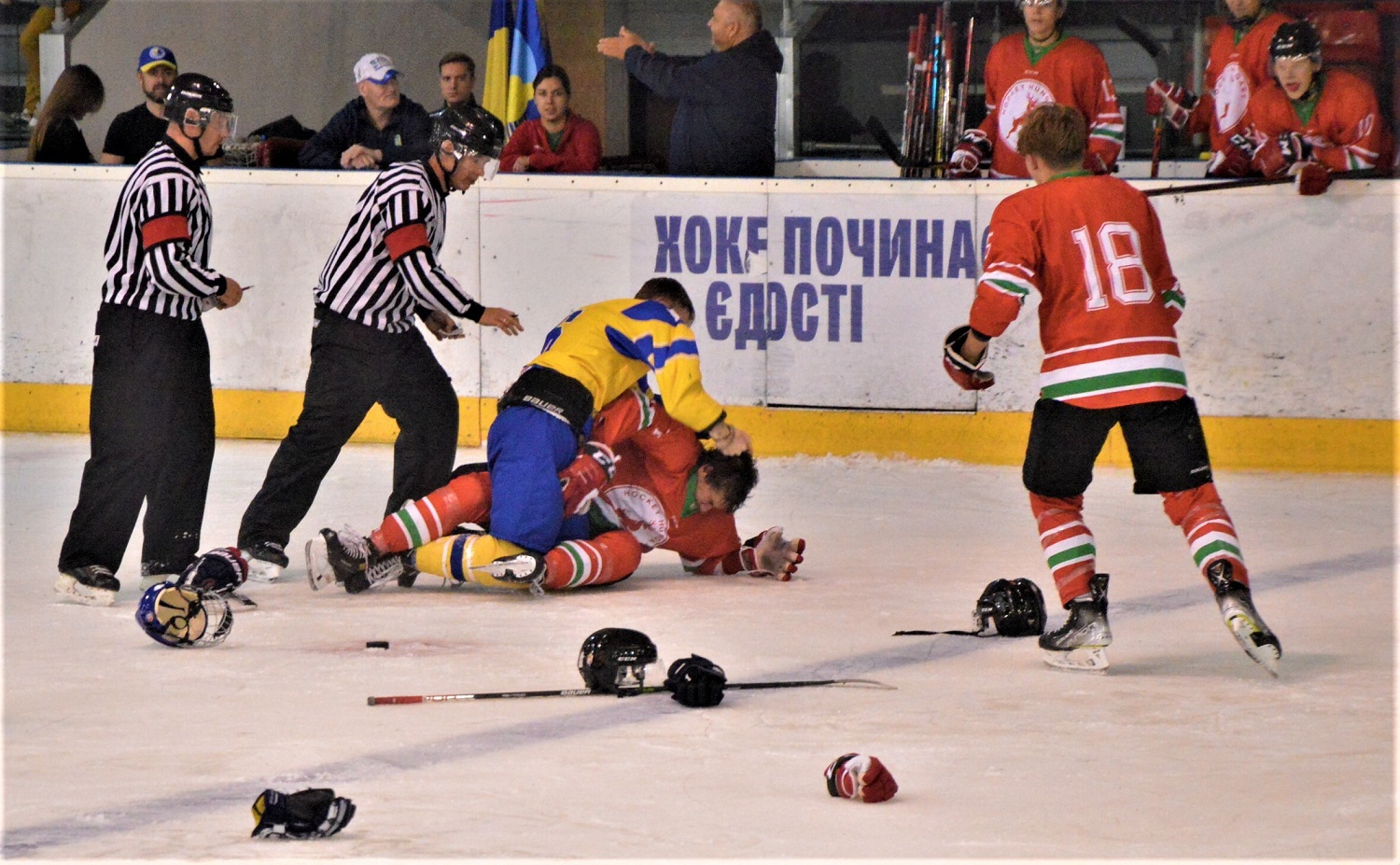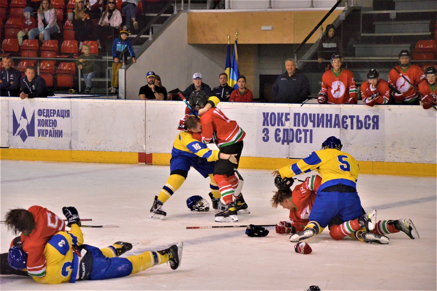 Во время хоккейного матча молодежной сборной Украины и Венгрии на броварской арене "Терминал" в рамках международного турнира началась массовая драка среди всех игроков на льду. Украинские хоккеисты поддались на провокации венгров, и набросились на них с кулаками.
