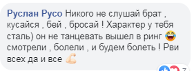 "Никого не слушай брат, кусайся, бей, бросай! Характер у тебя сталь) он не танцевать вышел в ринг. Смотрели, болели, и будем болеть ! Рви всех да и все".