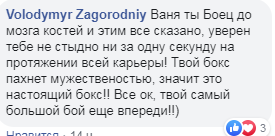 "Ваня, ты Боец до мозга костей и этим все сказано, уверен тебе не стыдно ни за одну секунду на протяжении всей карьеры! Твой бокс пахнет мужественностью, значит это настоящий бокс! Все ок, твой самый большой бой еще впереди!!)"