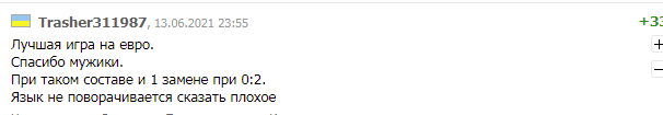 "Лучшая игра на Евро. Спасибо мужики. При таком составе и 1 замене при 0:2. Язык не поворачивается сказать плохое".