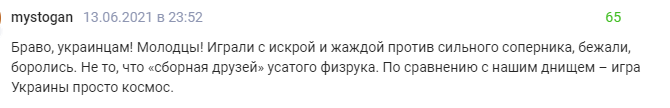 "Браво, украинцам! Молодцы! Играли с искрой и жаждой против сильного соперника, бежали, боролись. Не то, что "сборная друзей" усатого физрука. По сравнению с нашим днищем – игра Украины просто космос".