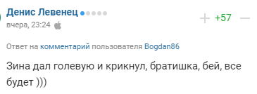 "Зина дал голевую и крикнул, братишка, бей, все будет )))".
