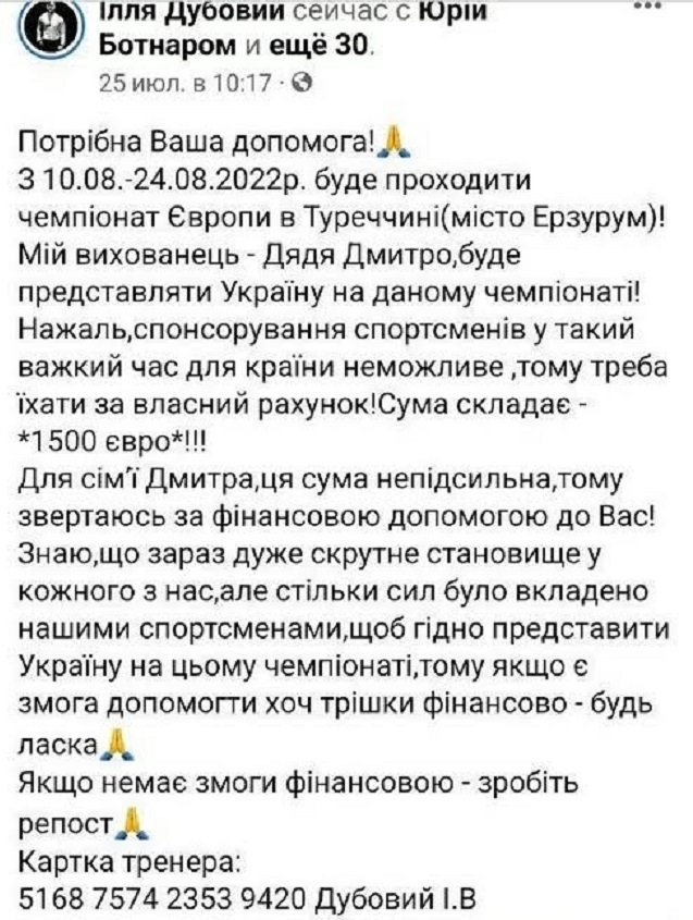 "Впервые за 15 лет сборная Украины по боксу среди юношей и девушек отправляется на Чемпионат Европы за свой счет... Все из-за отсутствия централизованного финансирования со стороны ФБУ. Части юных спортсменов удалось заручиться поддержкой региональных федераций и меценатов, а остальные вынуждены просить деньги в социальных сетях", - говорится в материале.