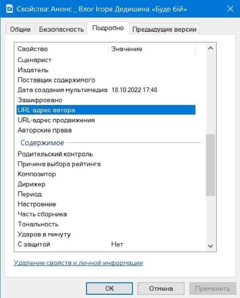 Однако, мета-данные анонса влаго содержат информацию, что видео якобы было создано 18.10.22 в 17.48 – через четыре с половиной часа после обнародования на YouTube. Это физически невозможно, поэтому можно утверждать, что мета-данные видео-файла изменили, чтобы скрыть факт его записи, вероятно, вечером 17 октября.