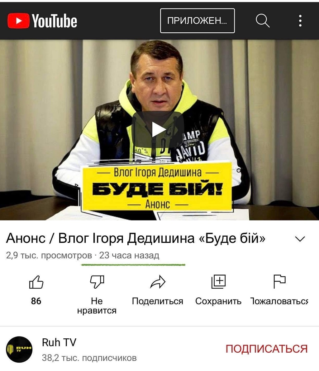 Так, видео-анонс влаги гендиректора ФК "Рух" Игоря Дедишина на Youtube-канале клуба было опубликовано 18.10.2022 в 13.20. В нем он заявляет об уголовных делах и угрожает генсеку УАФ Юрию Записоцкому. В частности, советует ему "быть мужественным".