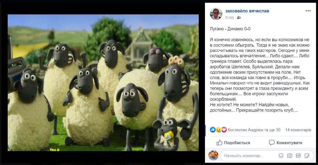 "Я, конечно, извиняюсь, но если вы колхозников не в состоянии обыграть, то тогда я не знаю, как можно рассчитывать на таких мастеров... Особо выделялась пара "акробатов" Шепелев и Буяльский: делали нам одолжение своим присутствием на поле. Нет слов, вся команда как г...о в проруби", - написал он в Facebook.