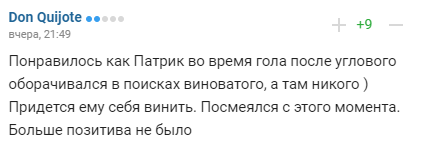 "Понравилось, как Патрик во время гола после углового оборачивался в поисках виноватого, а там никого) Придется ему себя винить. Посмеялся с этого момента. Больше позитива не было", - пишут пользователи.