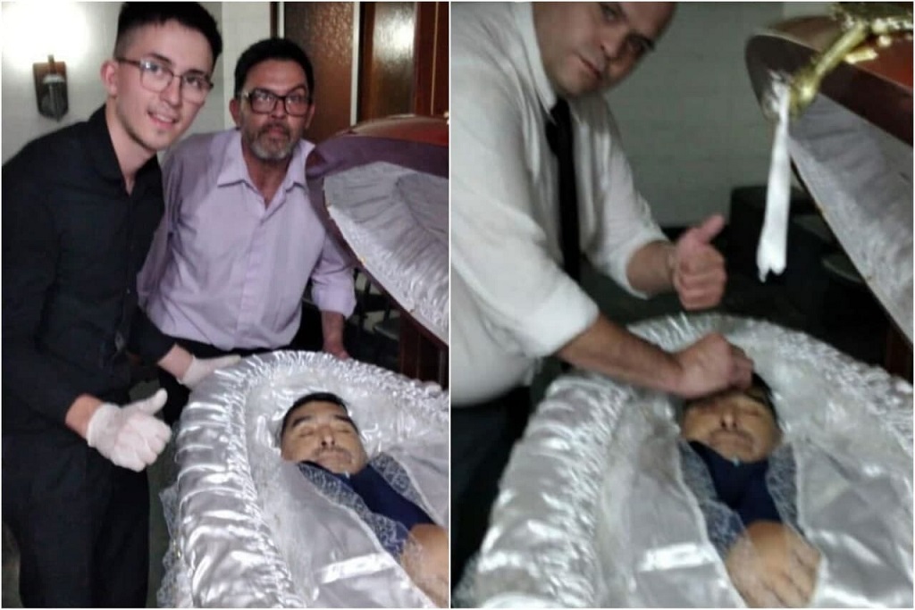 На фото, которое опубликовал в соцсетях сотрудник похоронного бюро Буэнос-Айреса Диего Молина, он положил правую руку на лоб Марадоне, а левой рукой показывает большой палец.