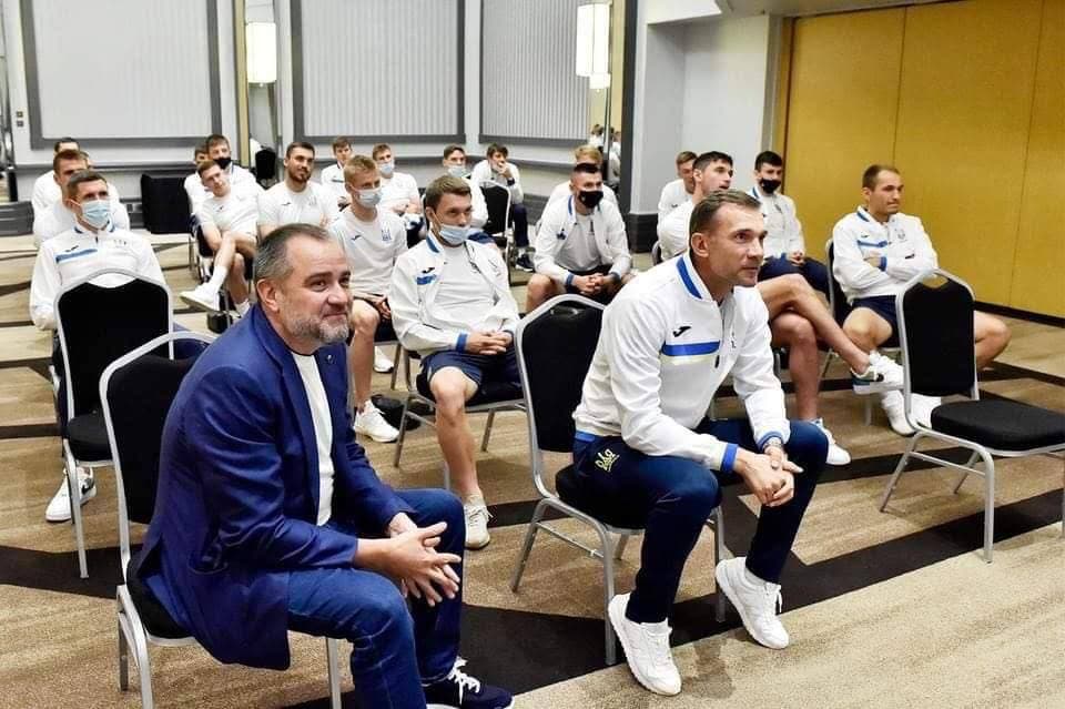 "... рядом со сборной в этот вечер бок о бок будут бороться более чем 40-миллионная разнообразная, но единая как никогда Украина, неделимые границы которой оберегом отмечены на груди каждого игрока команды, а также украинцы по всему миру. Миллионы украинских сердец будут биться сегодня в унисон с гимном нашего государства, в ритме "Червоной руты", которая обязательно зазвучит на трибунах, в ритме каждой атаки и удара по мячу сборной Андрея Шевченко! Ведь ко флешмобу, инициированному Президентом Украины Владимиром Зеленским в поддержку сине-желтых, за что ему очень благодарен и имею честь присоединиться, приобщается вся Украина!", - отметил он.