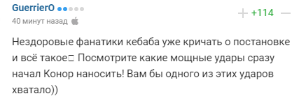 "Нездоровые фанатики кебаба уже кричат о постановке и все такое. Посмотрите, какие мощные удары сразу начал Конор наносить! Вам бы одного из этих ударов хватало))".