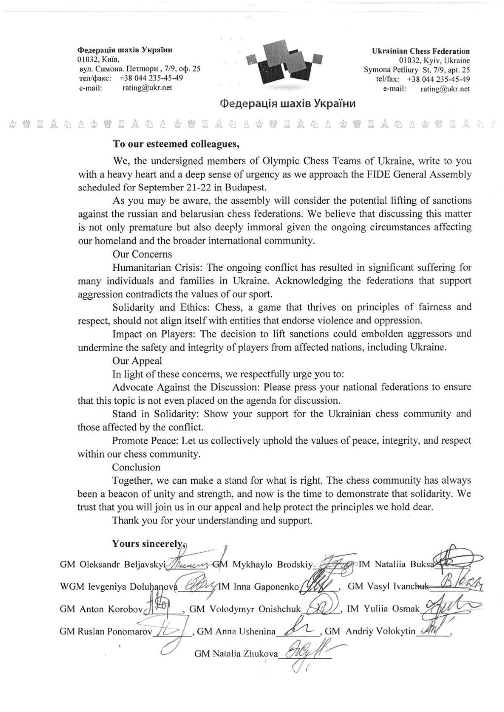 "Мы считаем, что обсуждение этого вопроса не только преждевременно, но и глубоко аморально, учитывая постоянные обстоятельства, влияющие на нашу Родину и международное сообщество... Признание федераций, поддерживающих агрессию, противоречит ценностям нашего спорта. Решение об отмене санкций может подбодрить агрессоров и подорвать безопасность игроков из пострадавших стран, включая Украину... Призываем вас давить на свои национальные федерации, чтобы эта тема даже не была включена в повестку дня для обсуждения. Выразите свою поддержку украинскому шахматному сообществу и тем, кто пострадал от конфликта. Давайте вместе поддерживать ценности мира, единства и уважения в нашем шахматном сообществе", - говорится в обращении.