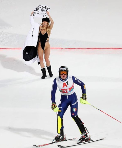 Так, девушка в одном купальнике выбежала на лыжную трассу в австрийском Шладминге, где проходил этапа Кубка мира по горным лыжам.