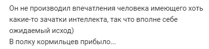 "Он не производил впечатления человека, имеющего хоть какие-то зачатки интеллекта, так что вполне себе ожидаемый исход). "В полку кормильцев прибыло".