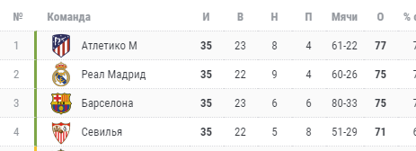"Барселона" и "Атлетико" сыграли вничью со счетом 0:0 и дали шанс "Реалу", но королевский клуб не сумел обыграть "Севилью" - 2:2. Таким образом, упорная борьба за титул продолжается. "Атлетико" сохранил первое место и на два очка опережает "Реал" и "Барселону". Теоретические шансы на титул сохраняет "Севилья", но это маловероятно.