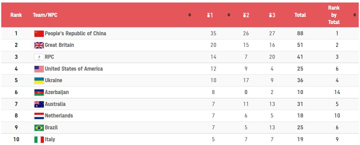 В общем медальном зачете Паралимпиады команда Украины уверенно удерживает четвертое место. В ее активе 36 наград: 10 – золотых, 17 – серебряных и 9 – бронзовых.