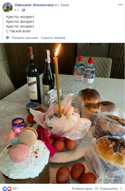 "Христос Воскрес! Христос Воскрес! Христос Воскрес! Поздравляю всех с Пасхой!" – написал Шовковский.