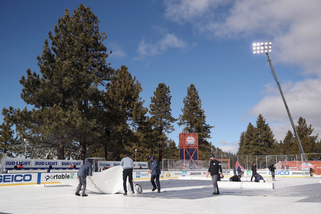 В США решили провести матч Национальной хоккейной лиги между "Колорадо Эвеланш" и "Вегас Голден Найтс" на открытом воздухе на берегу легендарного озера Тахо. Хоккейную площадку разместили в 50 метрах от воды, но спортивный праздник подпортила теплая погода, которая начала стремительно растапливать лед во время матча.