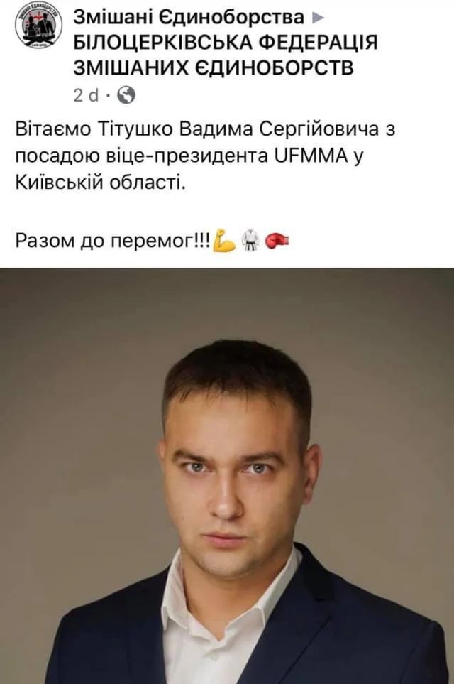 Но интересно, что в "Украинской Федерации Смешанных Боевых Искусств" недавно сообщили, что Титушко не имеет никакого отношения к федерации UFMMA. Там также пояснили, что "краткосрочное назначение было сделано на местном уровне и отменено сразу же, как это стало известно руководству федерации".