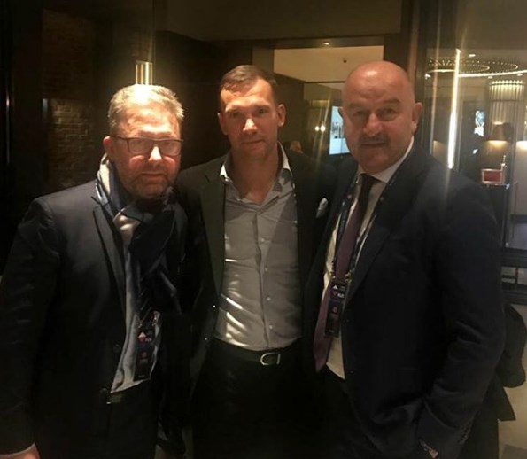 Снимок был сделан перед жеребьевкой группового этапа Лиги наций, которая состоялась накануне в Амстердаме (Нидерланды). Вместе с Шевченко и Черчесовым также сфотографировался главный тренер сборной Польши Ежи Бржечек.