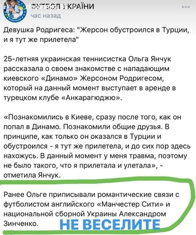 Так, он разместил скриншот материала со словами Янчук о ее нынешних отношениях с форвардом киевского "Динамо" Жерсоном Родригешем, который сейчас выступает на правах аренды за турецкий "Анкарагюджю". В конце упоминалось, что ранее Янчук приписывали романтические отношения с Зинченко.