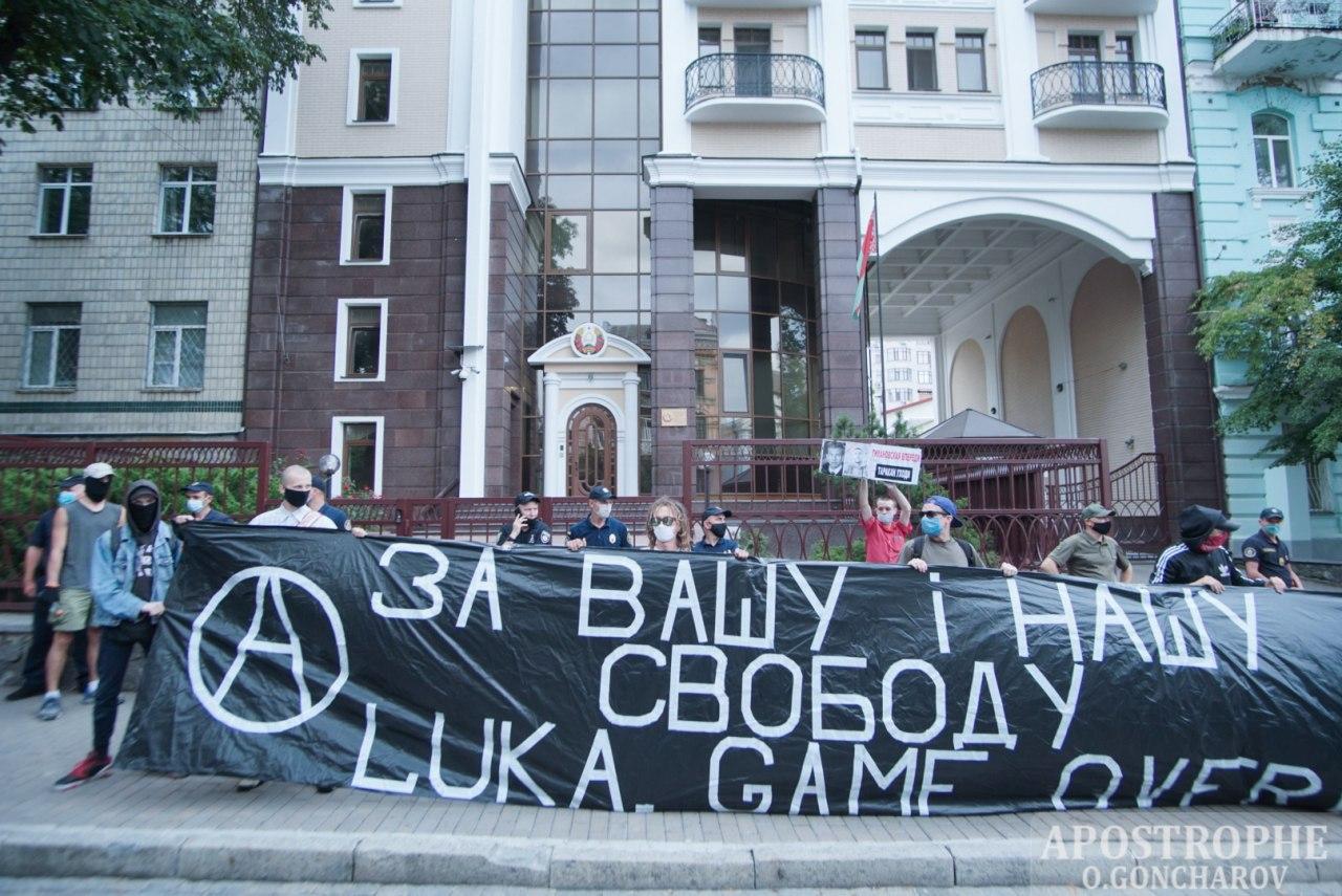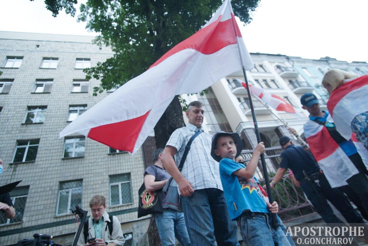 В понедельник, 10 августа, под посольством Беларуси в Киеве начали жечь фаеры и выкрикивать патриотические белорусские лозунги. Полиция задержала двоих участников акции.