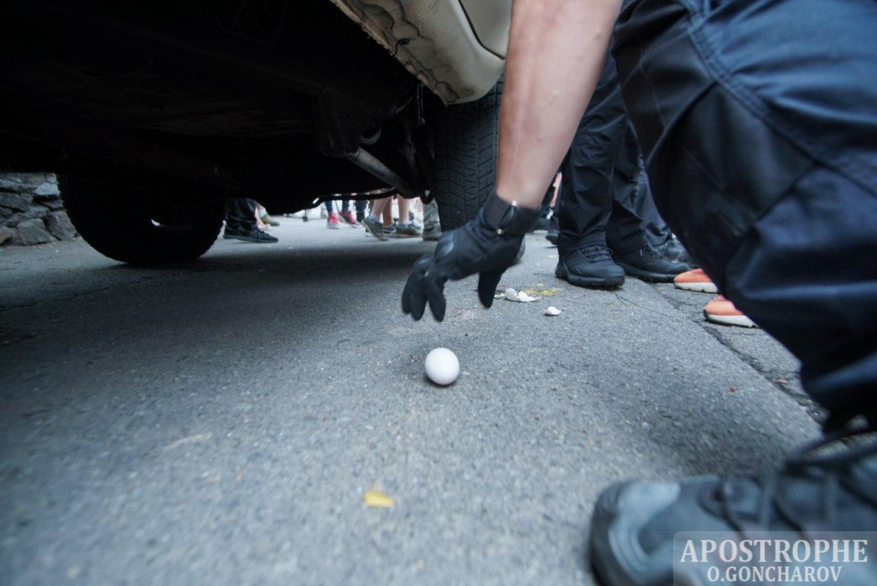 Согласно предварительной информации с места событий, людей у посольства задержали за то, что у одного из протестующих в руках были куриные яйца.