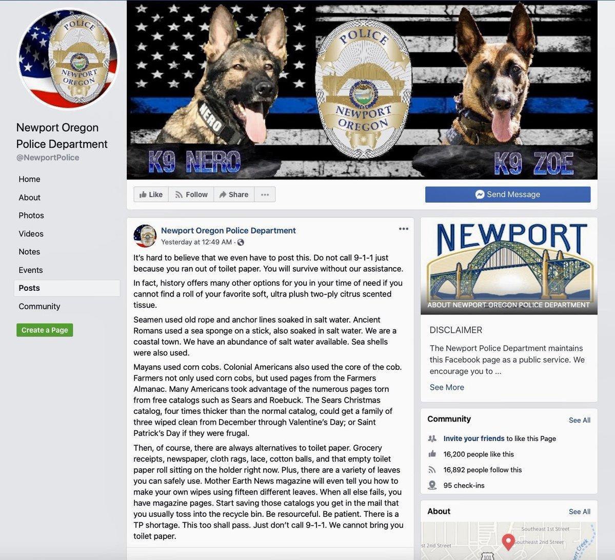 В США, куда коронавирус также добрался, полиция города Ньюпорт (штат Орегон) призвала жителей не звонить в "911", если у них закончилась туалетная бумага.