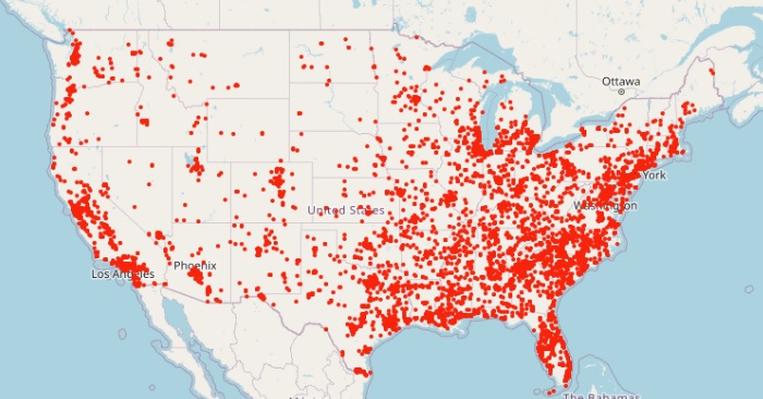 Скриншот, приведенные ниже, показывает распределение подобных инцидентов по территории страны. Больше всего убийств, нападений и суицидов происходит в районе атлантического побережья. Там кучность населения наиболее высокая. В центральных регионах США преступлений совершается меньше всего.