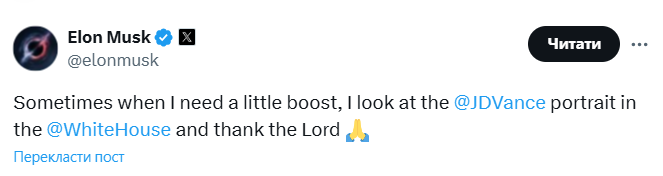 "Иногда, когда мне нужно немного мотивации, я смотрю на портрет вице-президента Джей Ди Вэнса в Белом доме и благодарю Бога", - пишет глава DOGE.