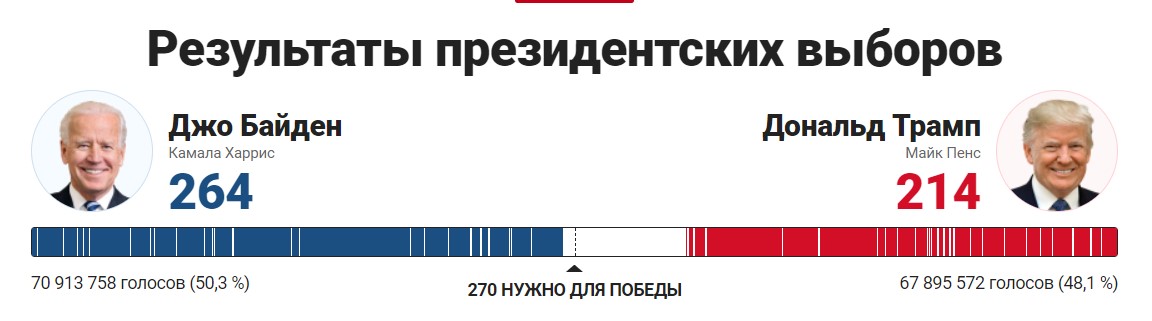 Таким образом, у Байдена 264 голосов, а у действующего президента Дональда Трампа - 214. Для победы на выборах Байдену не хватает всего 6 голосов.