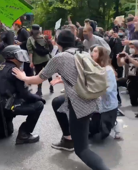 Участники протестов отреагировали на такое поведение полицейских с радостью: на кадрах из Портланда (Орегон) видно, как демонстранты пожимают руки полицейским.