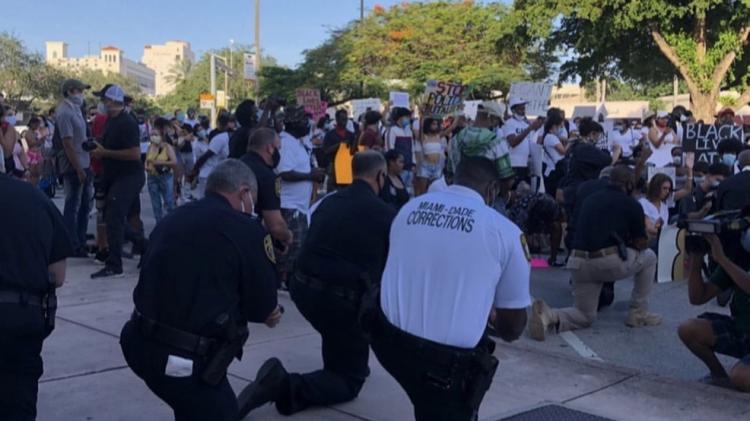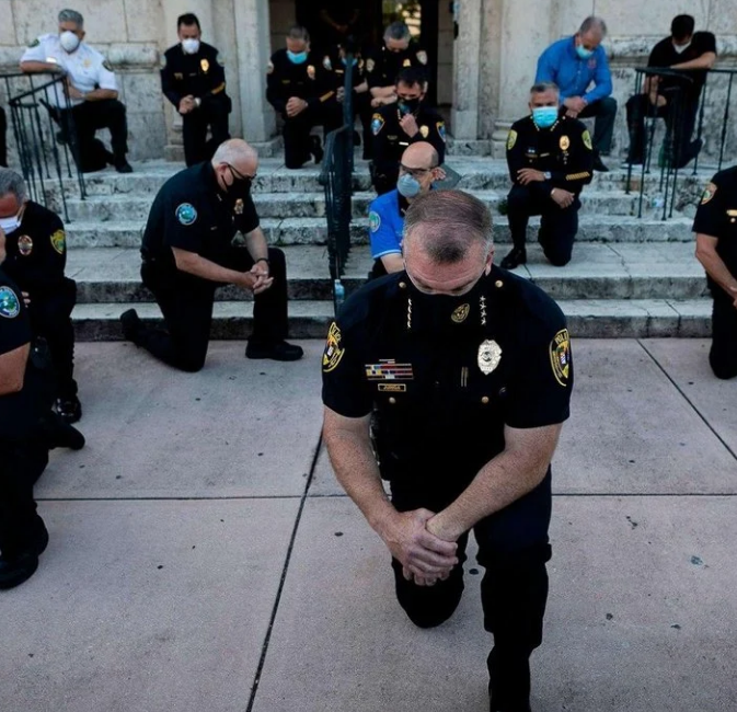 На колени опустились и полицейские во Флориде, Калифорнии, Вашингтоне и Нью-Йорке.