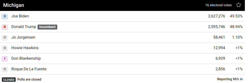 В штате Мичиган у Байдена пока 49.53 % голосов, у его соперника от республиканцев, действующего президента Дональда Трампа - 48.94 %.
