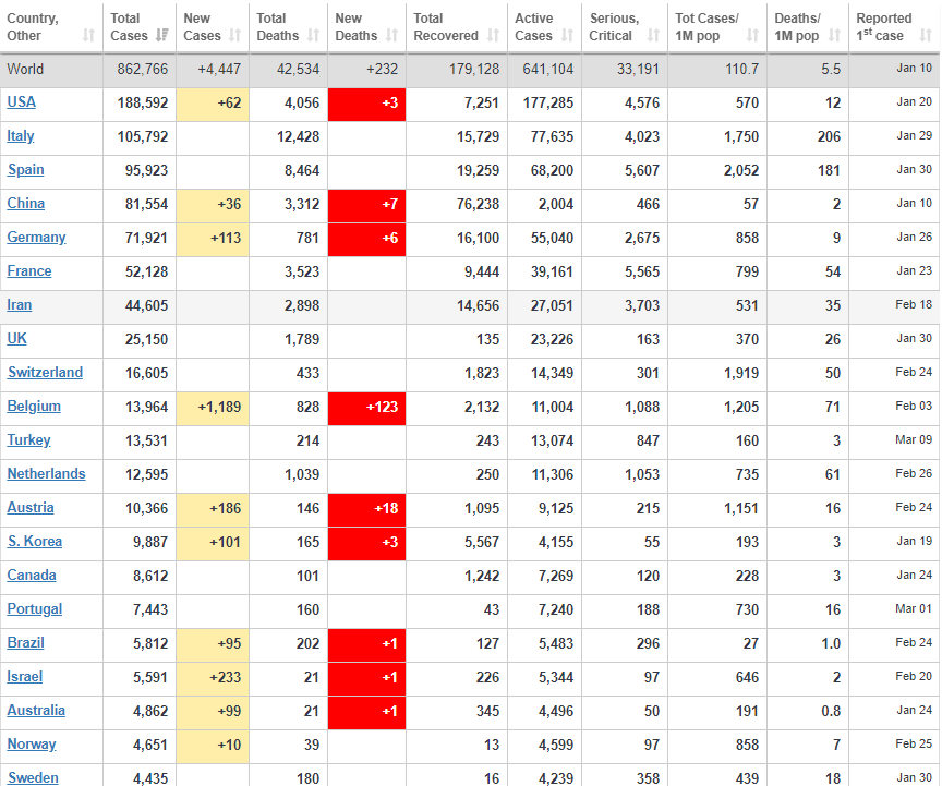 Таким образом США закрепились на третьем месте в мировом антирейтинге, в котором лидирует Италия, где зарегистрировано 12 428 смертельных случаев. На втором месте Испания с 8 464 жертвами, в Китае, по последним данным, умерли 3312 граждан.