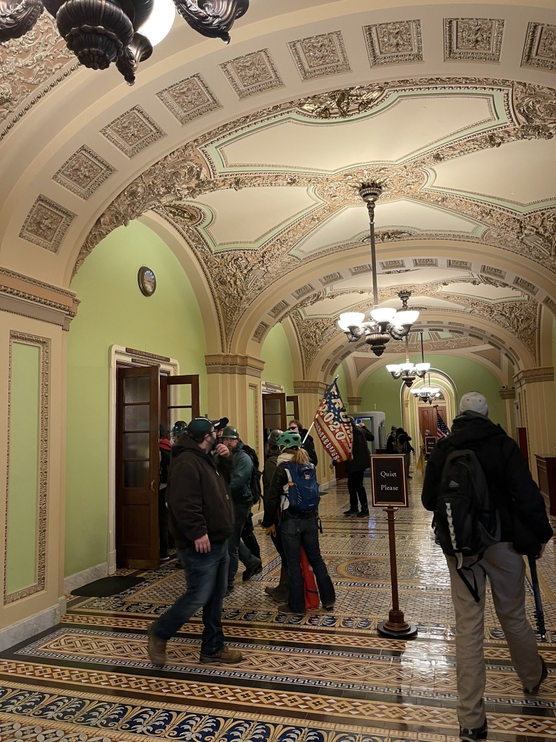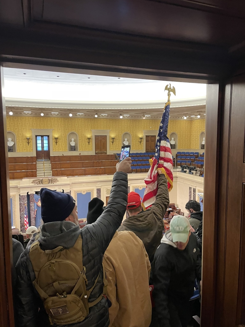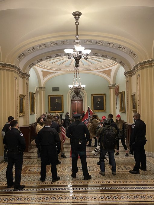 Заседание было прервано, сенаторы заперлись в своей палате, а протестующие в шляпах Трампа "Сделаем Америку снова великой" и с флагами подошли к дверям зала.