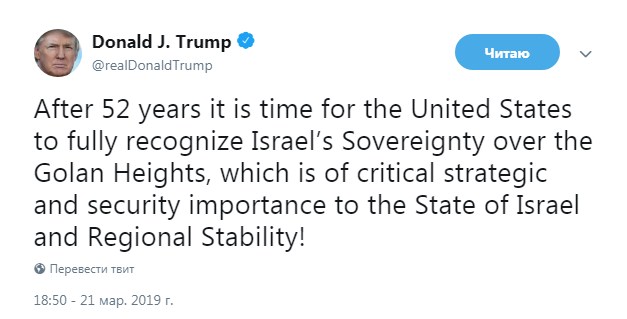 "Спустя 52 года Соединенным Штатам пора полностью признать суверенитет Израиля над Голанскими высотами, которые имеют критически важное стратегическое значение для безопасности государства Израиль и региональной стабильности", - написал Трамп.