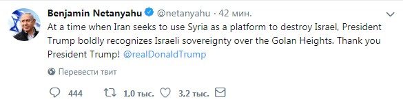 "Во времена, когда Иран пытается использовать Сирию в качестве платформы, чтобы уничтожить Израиль, президент Трамп смело признает суверенитет Израиля над Голанскими высотами. Спасибо вам, президент Трамп", - написал он в Twitter.