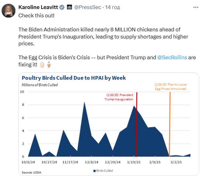 "Администрация Байдена убила почти восемь миллионов кур накануне инаугурации президента Трампа, что привело к дефициту предложения и росту цен", - написала Левитт в публикации и добавила инфографику.
