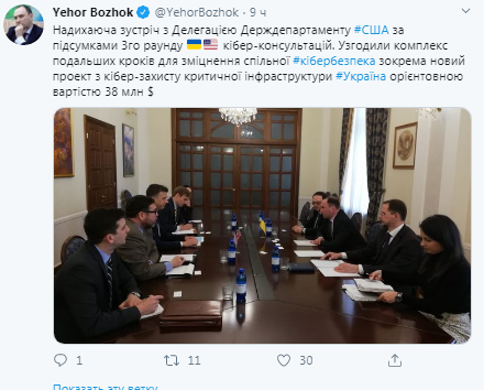 "Вдохновляющая встреча с делегацией Госдепартамента США по итогам 3-го раунда украино-американских киберконсультаций. Согласовали комплекс дальнейших шагов для укрепления общей кибербезопасности, в частности новый проект по киберзащите критической инфраструктуры Украины ориентировочной стоимостью 38 млн долларов", - написал Божок.