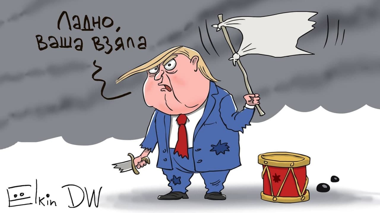 Известный художник Сергей Елкин на карикатуре, опубликованной в его Telegram-канале изобразил Трампа в образе бойца с поломанным мечем, который сдается и поднимает белый флаг.