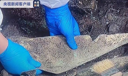 Также археологи обнаружили 28-сантиметровую бронзовую статуэтку в спящем положении, голова которой связана с отбитой рифленой медной полосой. Как описывают в CCTV, ее голова повернута к правой стороне туловища, имеет высокий нос и глубокие глазницы.