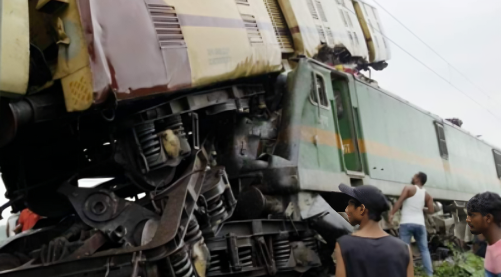 В сообщении говорится, что в понедельник, 17 июня около 08:45 по местному времени (6:15 по киевскому времени), в Индии вблизи Нью-Джалпайгури столкнулись скоростной и товарный поезда, удар был настолько мощным, что вытолкнул вагон поезда с рельсов, подняв вверх. На фотографии можно заметить, что вагон завис в воздухе на высоте нескольких метров.